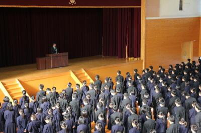 校長式辞で、一学期中に本校の生徒が行った善行について紹介されました。そのほか、皆勤率の高さ、漢字テストの頑張りなど、良かった点について紹介されました。